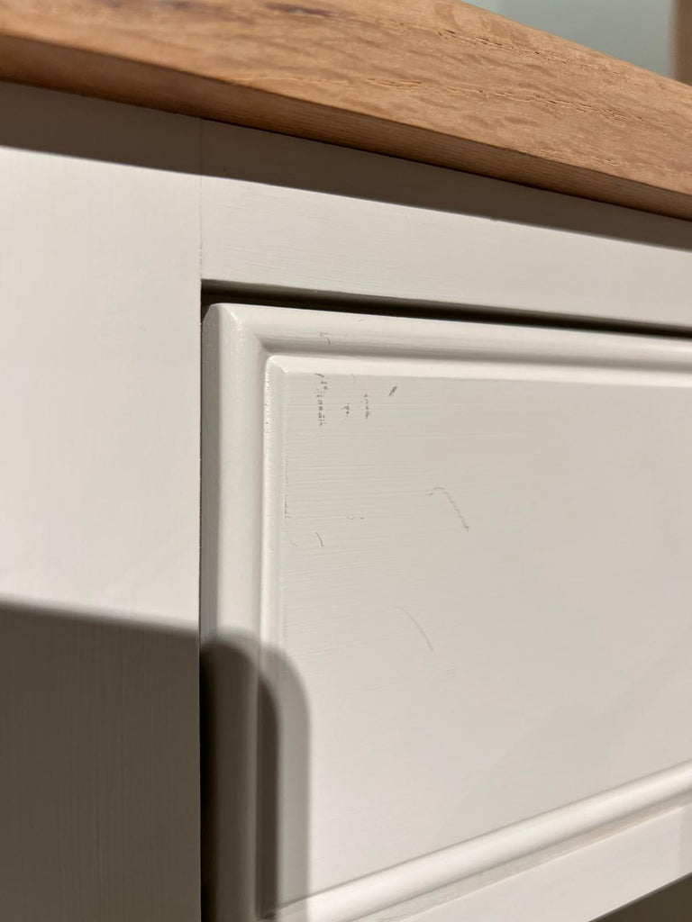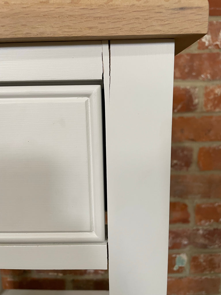 - Timber movement and cracking to the front of the frame, with light marks and scratches to the drawer front paintwork and legs