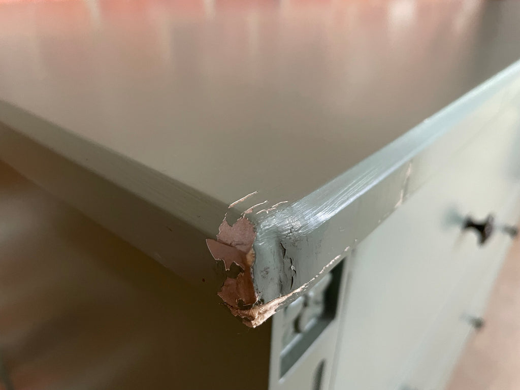 • Impact damage to one of the corners and multiple dents along the edges of the tabletop