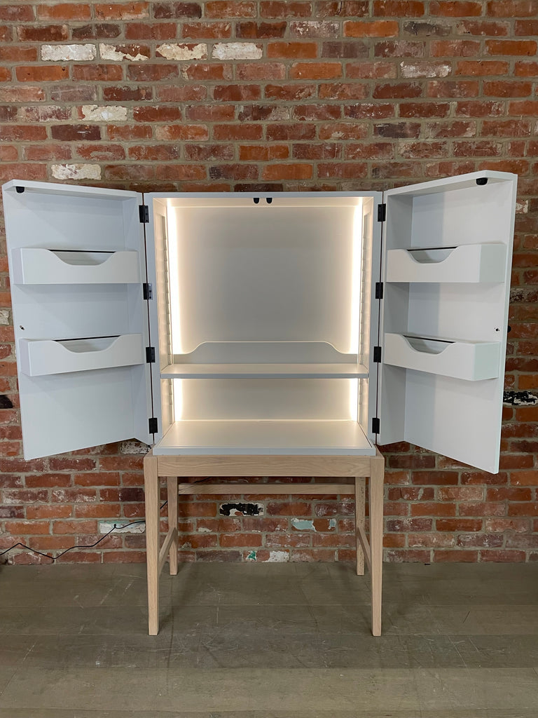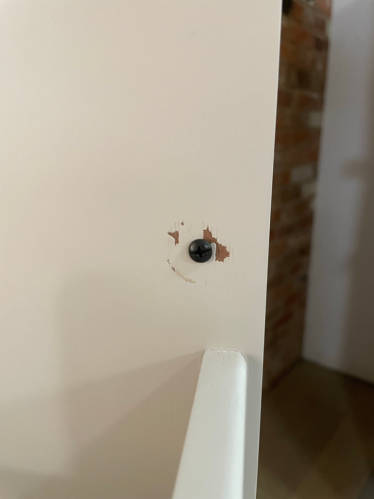 - Scratches, marks, chips, dents and imperfections to the painted finish across the cabinet frame, internally and externally, and to the wooden legs