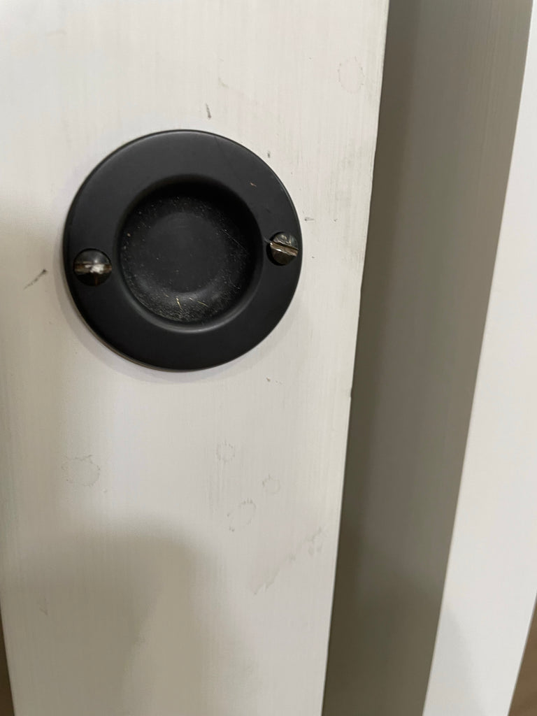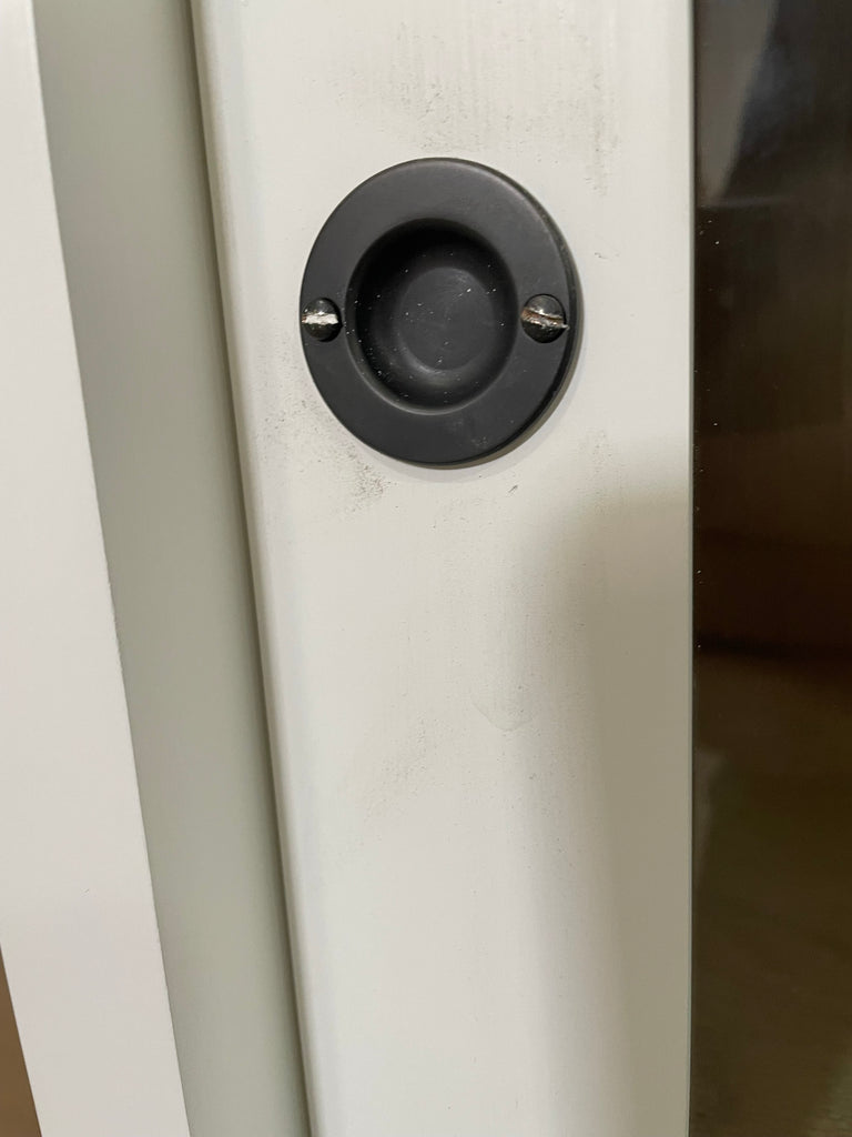 - Scratches, marks, chips, dents, discolouration and imperfections to the painted finish across the cabinet and glass doors