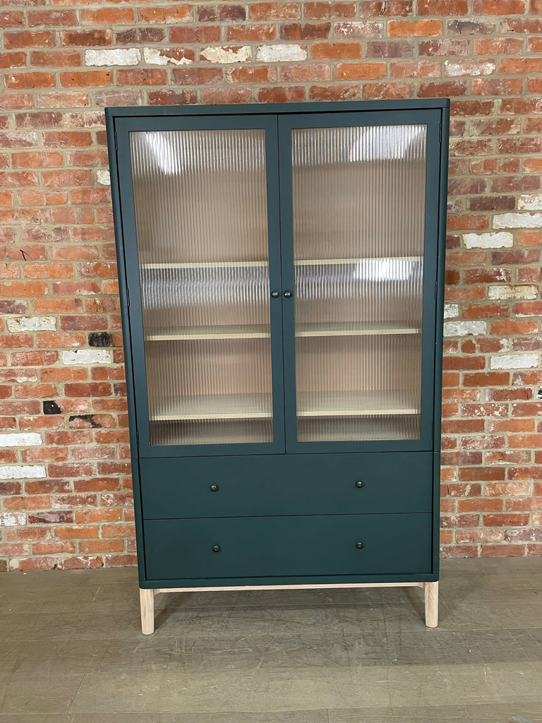 Offering the flexibility of freestanding kitchen cabinetry with the minimalist aesthetic of our Farlow collection, this fluted glass-fronted larder combines quality craftsmanship with refined style. Its customisable painted outer frame contrasts beautifully with the exposed oak interior, which features adjustable zig-zag shelving for versatile storage and two deep drawers. Built using traditional mortise-and-tenon joinery, this larder is crafted to stand the test of time and is perfect for storing kitchen essentials.