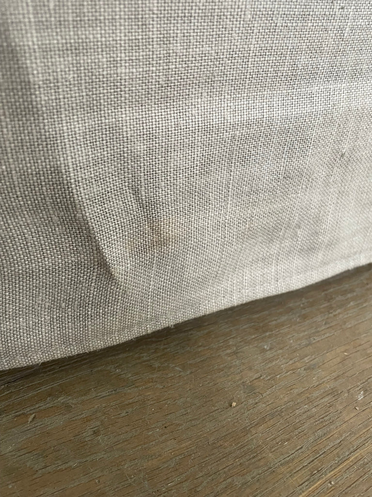 - Multiple dirty marks across the upholstered covers of the sofa, heavily around the corners and edges of the sofa & seat cushions