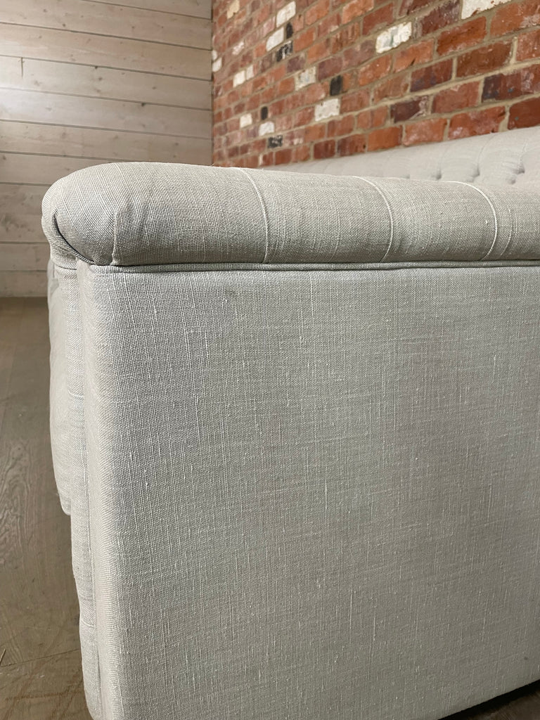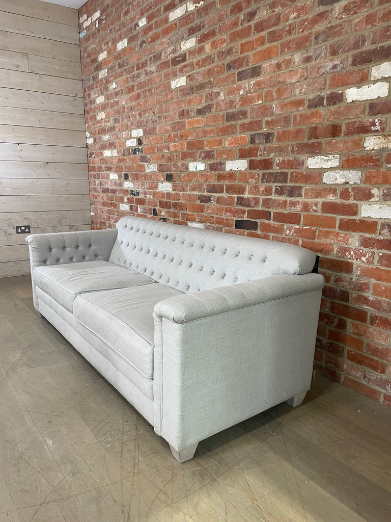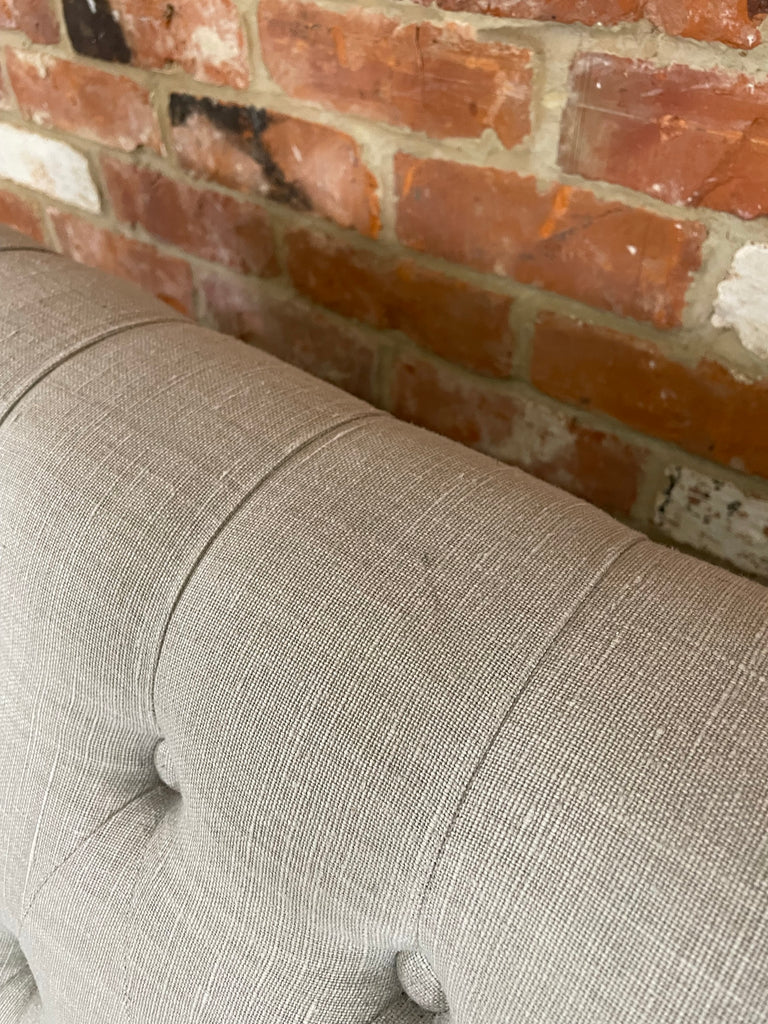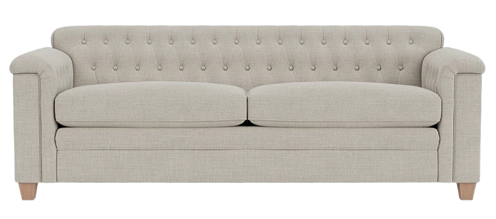 The Lottie four-seater sofa was inspired by a true British design icon: the Chesterfield sofa. It's defined by its buttoned backrest and inner arms and its high armrests with elegant, tucked details. A kiln-dried tulipwood and birch plywood frame ensures lasting durability while the finest upholstery fillings and luxuriously deep seat cushions promise comfort. This grand version rests on square tapered oak legs and will seat up to four people.