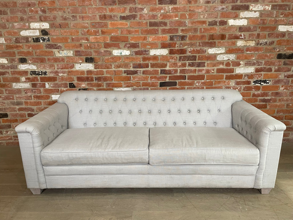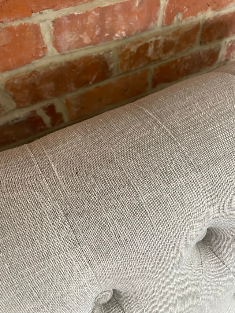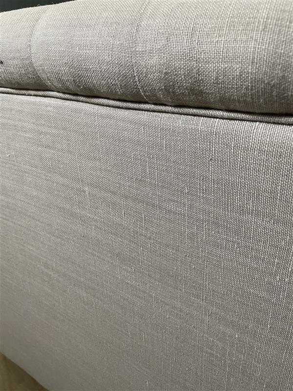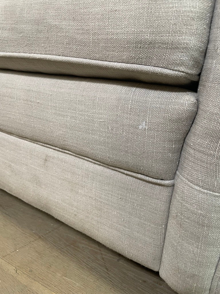 • Signs of wear the the upholstery across the backrest and arms, with dirty marks and discolouration to the fabric across the sofa