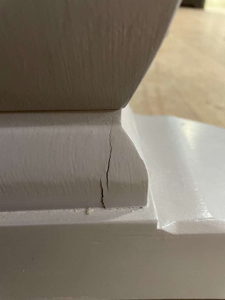 - Crack to one of the legs, with multiple scratches and minor dents across the painted frame and legs