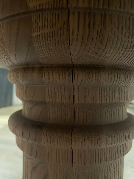 - Multiple small cracks along the grain of the wooden base pillar. We cannot guarantee how this will behave overtime and as it can expand or contact depending the environment the table to placed in